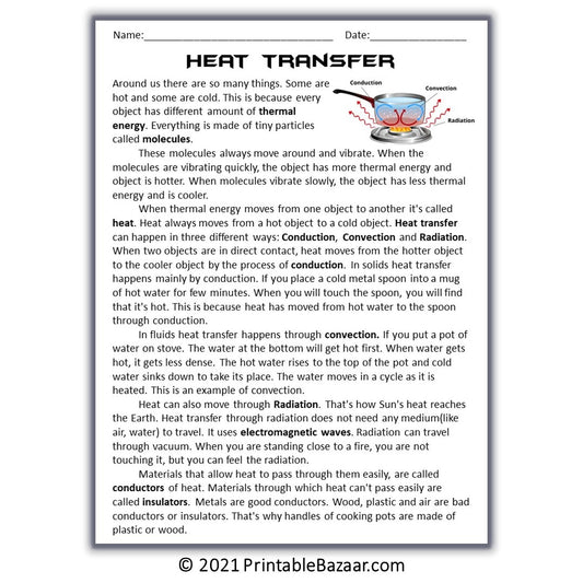 Heat Transfer (Thermal Energy) Reading Comprehension Passage and Questions