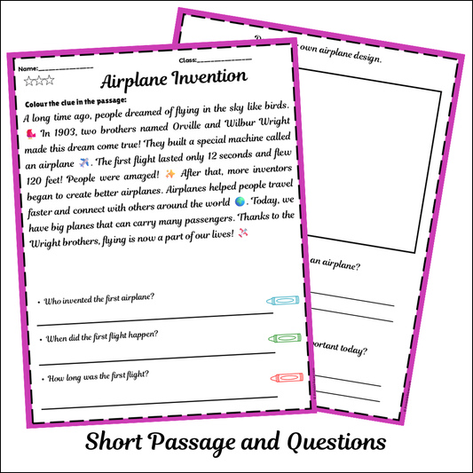 Airplane Invention | Short Reading Comprehension Creative Worksheet