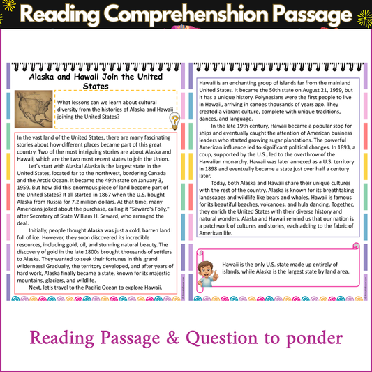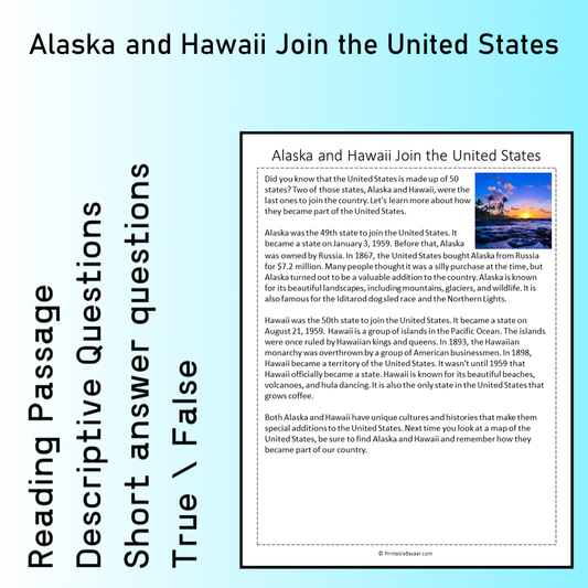 Alaska and Hawaii Join the United States | Reading Comprehension Passage Printable Worksheet