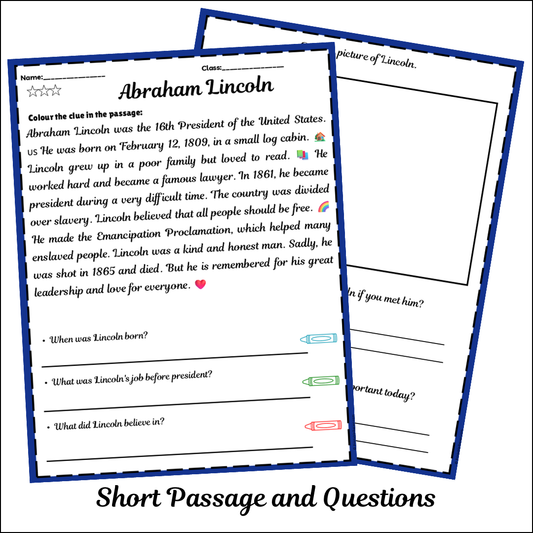 Abraham Lincoln | Short Reading Comprehension Creative Worksheet