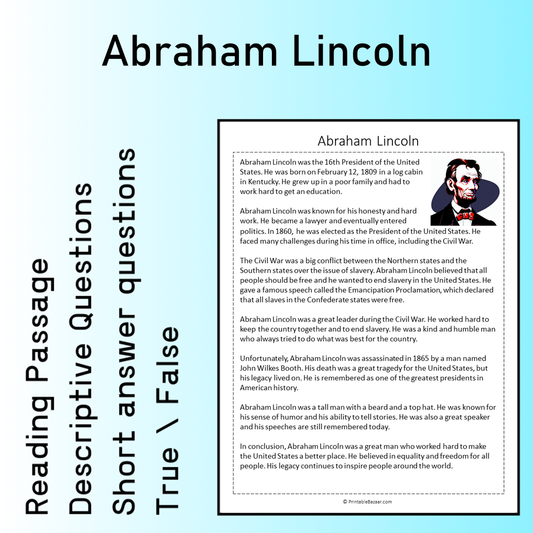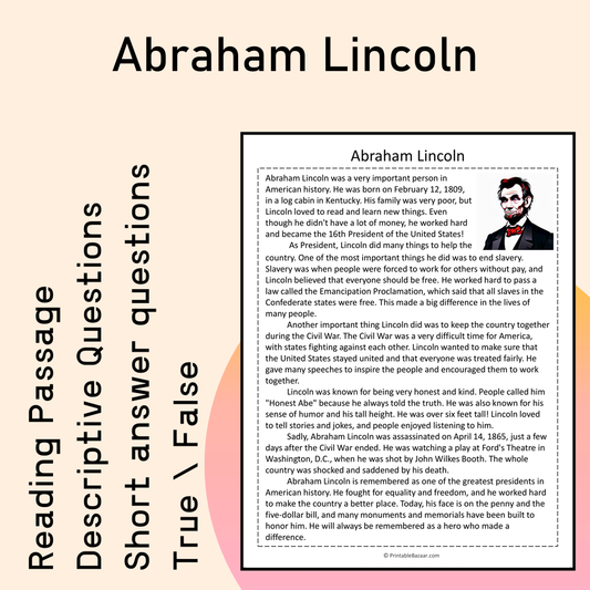 Abraham Lincoln | Reading Comprehension Passage Printable Worksheet