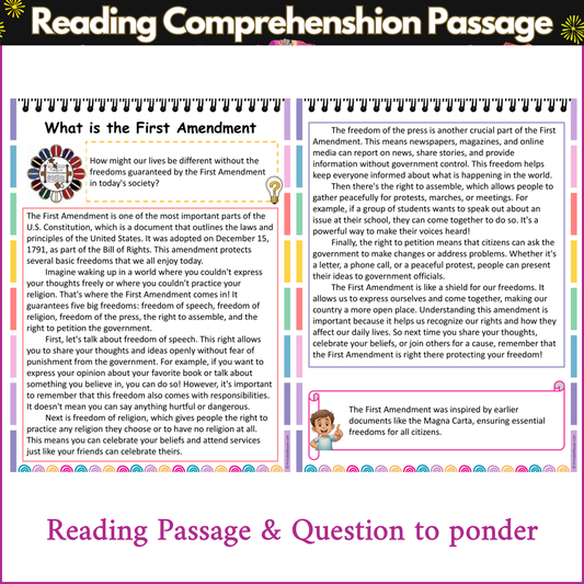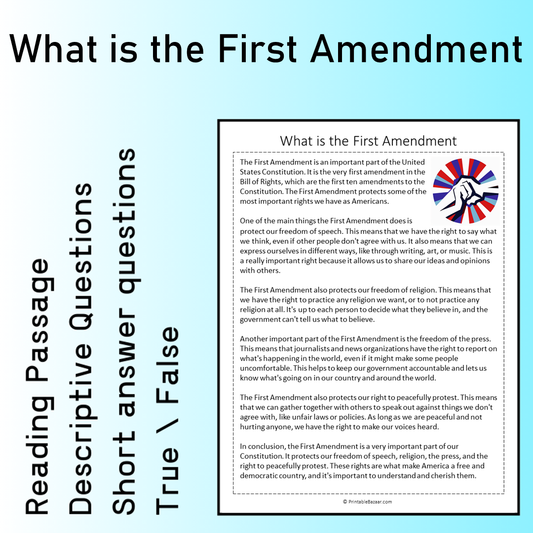 What is the First Amendment | Reading Comprehension Passage Printable Worksheet