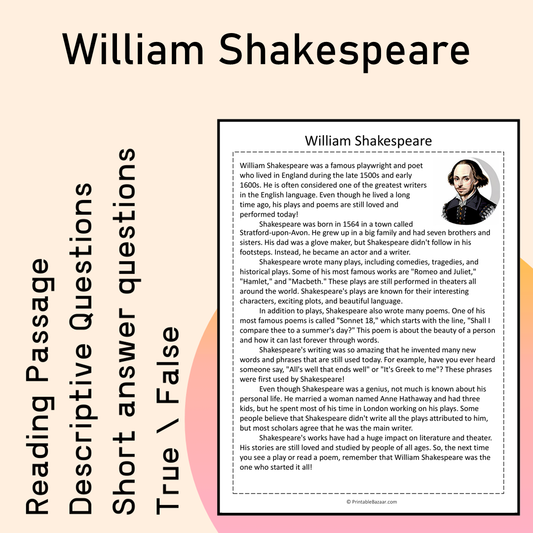 William Shakespeare | Reading Comprehension Passage Printable Activity