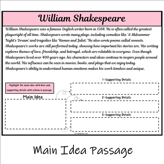 William Shakespeare | Main Idea and Supporting Details Reading Passage and Questions