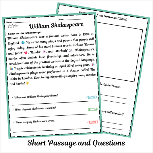 William Shakespeare | Short Reading Comprehension Creative Worksheet