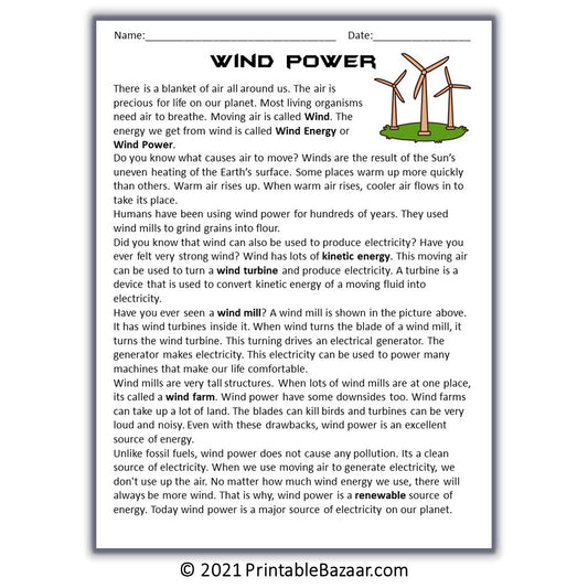 Wind Energy | Reading Comprehension Passage Printable Worksheet