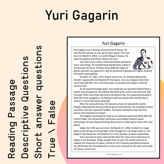 Yuri Gagarin | Reading Comprehension Passage Printable Activity