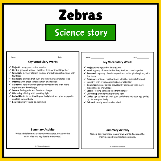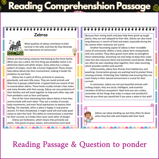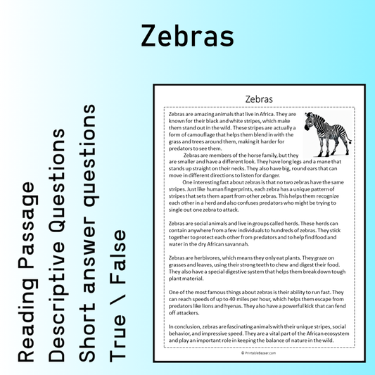 Zebras | Reading Comprehension Passage Printable Worksheet