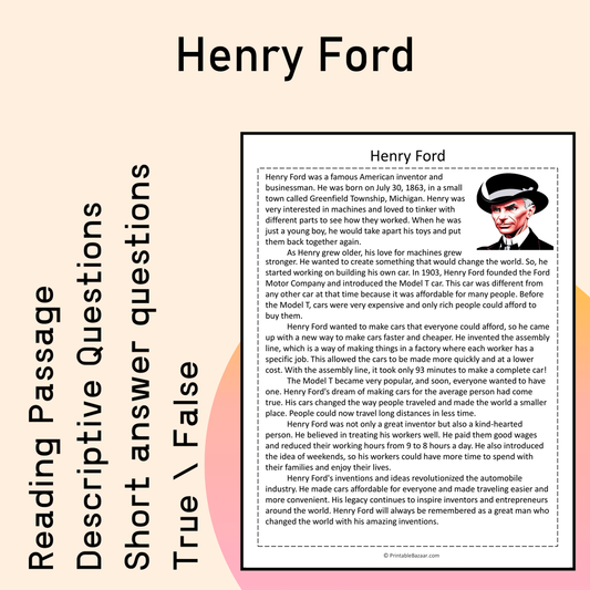 Henry Ford | Reading Comprehension Passage Printable Activity
