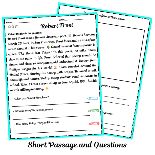 Robert Frost | Short Reading Comprehension Creative Worksheet