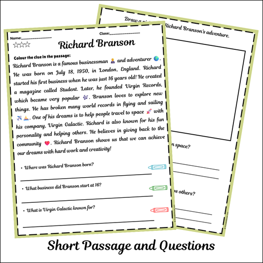 Richard Branson | Short Reading Comprehension Creative Worksheet