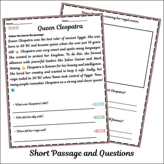 Queen Cleopatra | Short Reading Comprehension Creative Worksheet