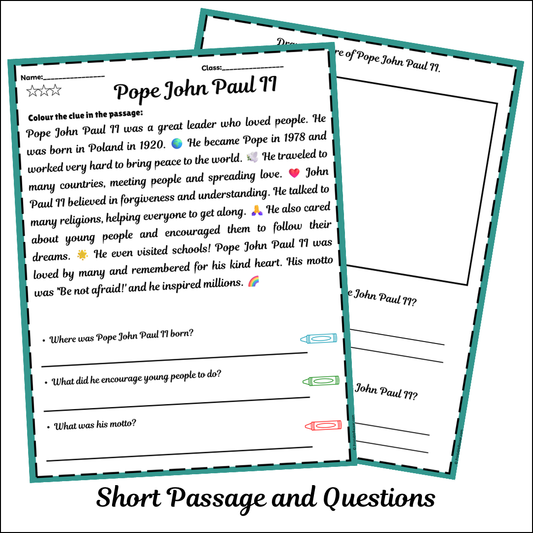 Pope John Paul II | Short Reading Comprehension Creative Worksheet