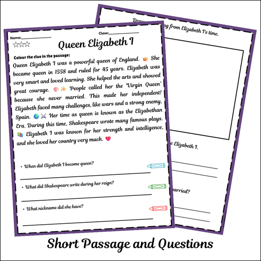 Queen Elizabeth I | Short Reading Comprehension Creative Worksheet