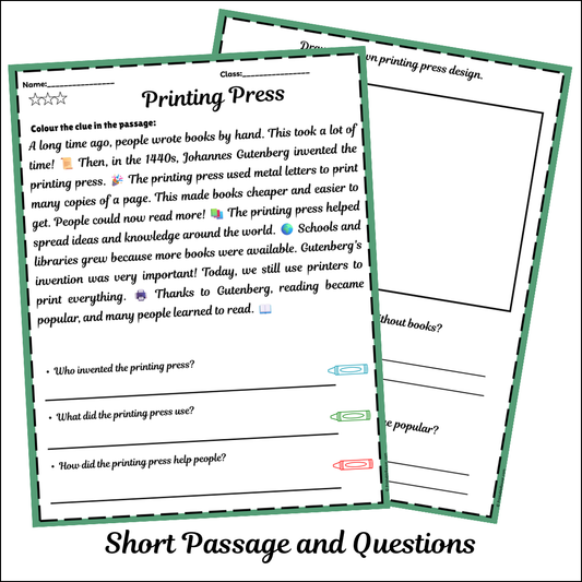Printing Press | Short Reading Comprehension Creative Worksheet