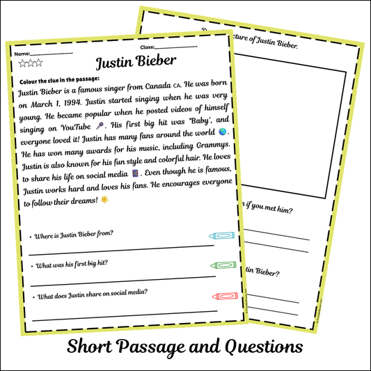 Justin Bieber | Short Reading Comprehension Creative Worksheet