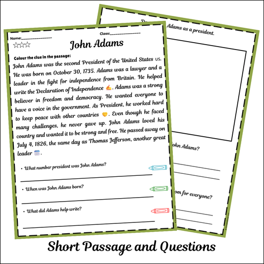 John Adams | Short Reading Comprehension Creative Worksheet