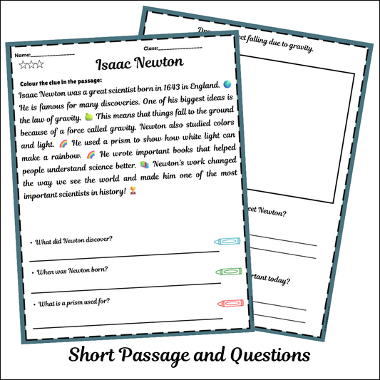 Isaac Newton | Short Reading Comprehension Creative Worksheet