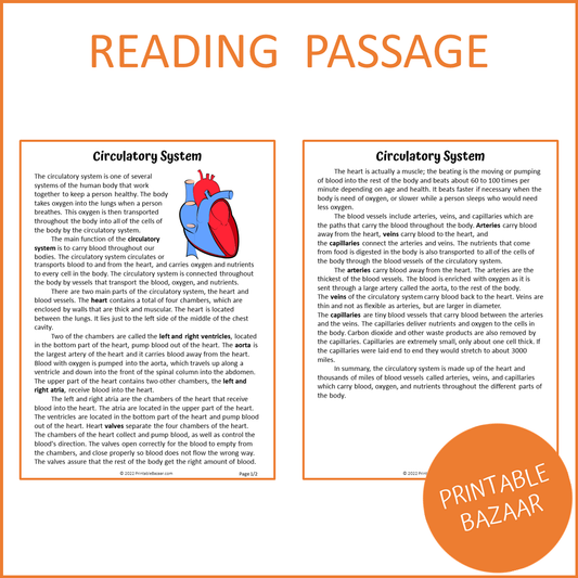 Circulatory System Reading Comprehension Passage and Questions | Printable PDF
