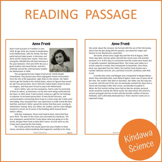 Anne Frank Reading Comprehension Passage and Questions | Printable PDF