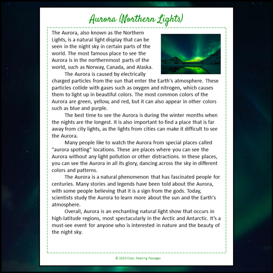 Aurora (Northern Lights) Reading Comprehension Passage and Questions | Printable PDF