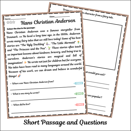 Hans Christian Andersen | Short Reading Comprehension Creative Worksheet