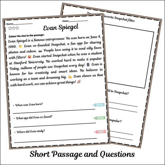 Evan Spiegel | Short Reading Comprehension Creative Worksheet