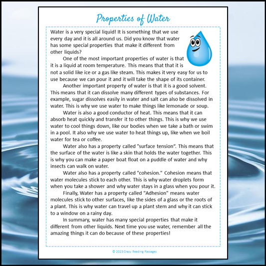 Properties Of Water Reading Comprehension Passage and Questions | Printable PDF