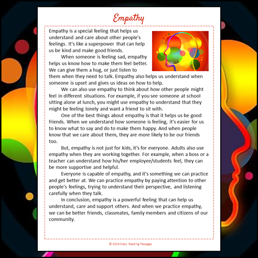 Empathy Reading Comprehension Passage and Questions | Printable PDF