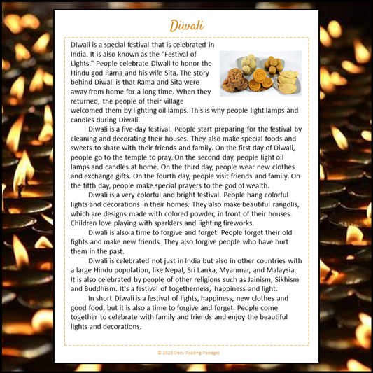 Diwali Reading Comprehension Passage and Questions | Printable PDF