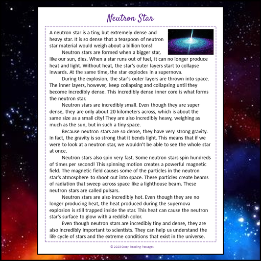 Neutron Star Reading Comprehension Passage and Questions | Printable PDF