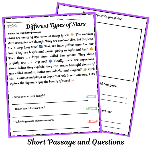Different Types of Stars | Short Reading Comprehension Creative Worksheet
