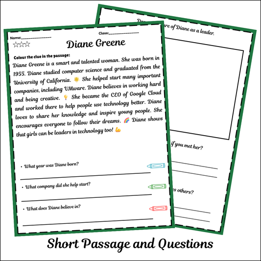 Diane Greene | Short Reading Comprehension Creative Worksheet