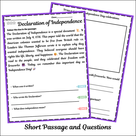 Declaration of Independence | Short Reading Comprehension Creative Worksheet