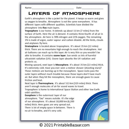 Layers of Atmosphere Reading Comprehension Passage and Questions