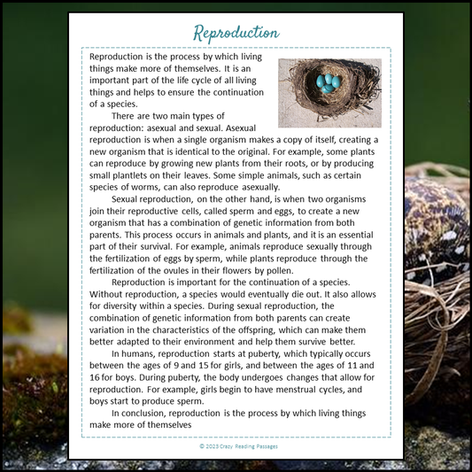 Reproduction Reading Comprehension Passage and Questions | Printable PDF