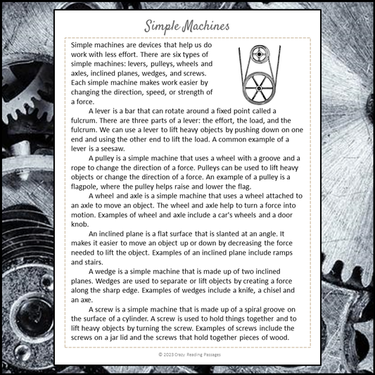 Simple Machines Reading Comprehension Passage and Questions | Printable PDF