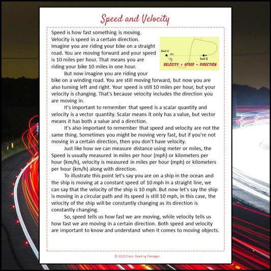Speed And Velocity Reading Comprehension Passage and Questions | Printable PDF
