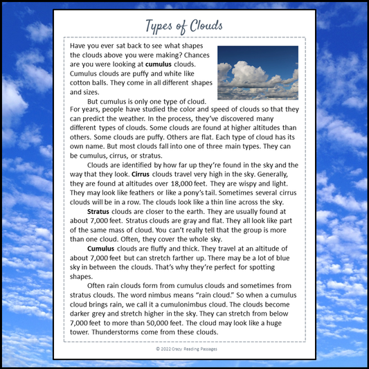 Types Of Clouds Reading Comprehension Passage and Questions | Printable PDF