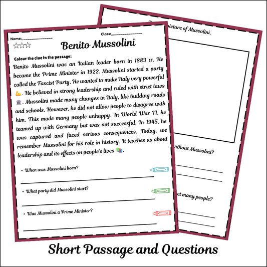 Benito Mussolini | Short Reading Comprehension Creative Worksheet