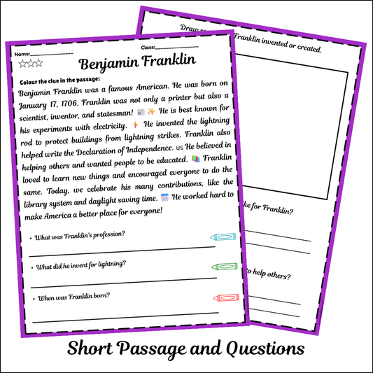 Benjamin Franklin | Short Reading Comprehension Creative Worksheet