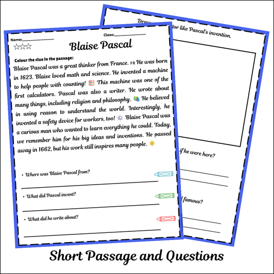 Blaise Pascal | Short Reading Comprehension Creative Worksheet