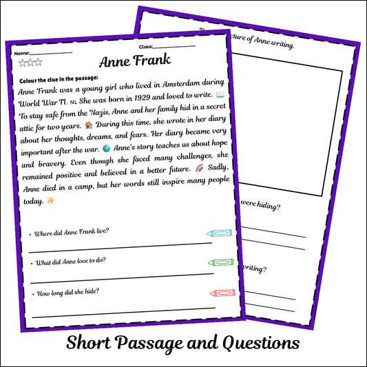 Anne Frank | Short Reading Comprehension Creative Worksheet