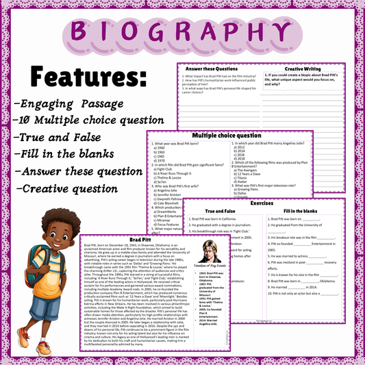 Brad Pitt | Biography Reading Comprehension and Questions Worksheet