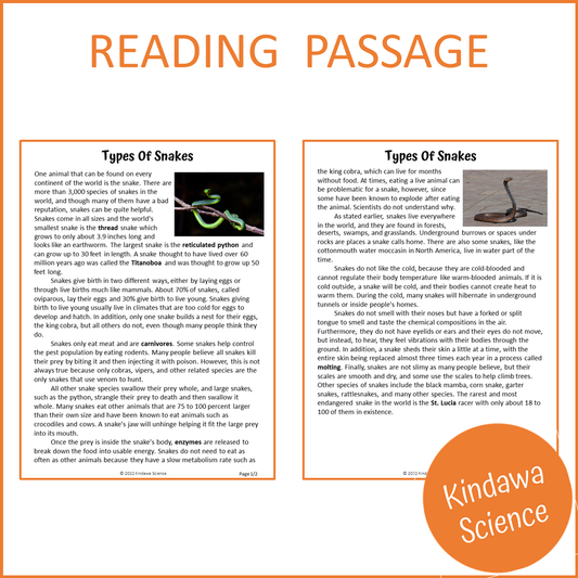 Types Of Snakes Reading Comprehension Passage and Questions | Printable PDF