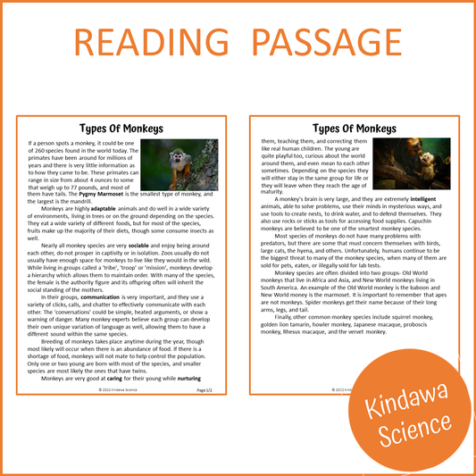 Types Of Monkeys Reading Comprehension Passage and Questions | Printable PDF