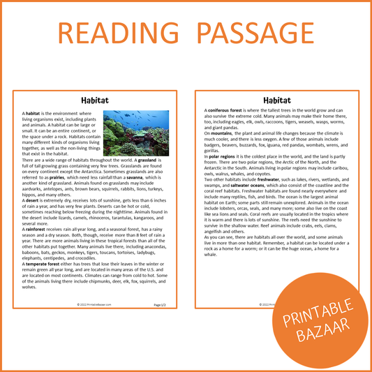 Habitat Reading Comprehension Passage and Questions | Printable PDF