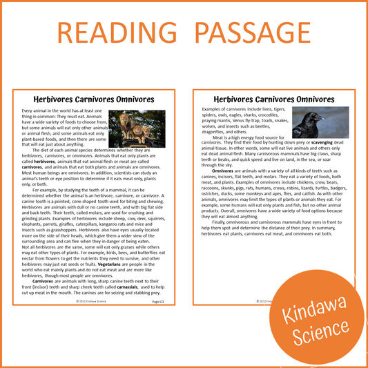 Herbivores Carnivores Omnivores Reading Comprehension Passage and Questions | Printable PDF