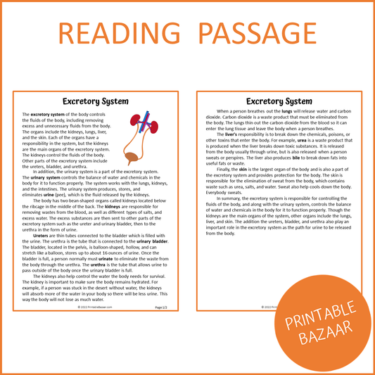 Excretory System Reading Comprehension Passage and Questions | Printable PDF