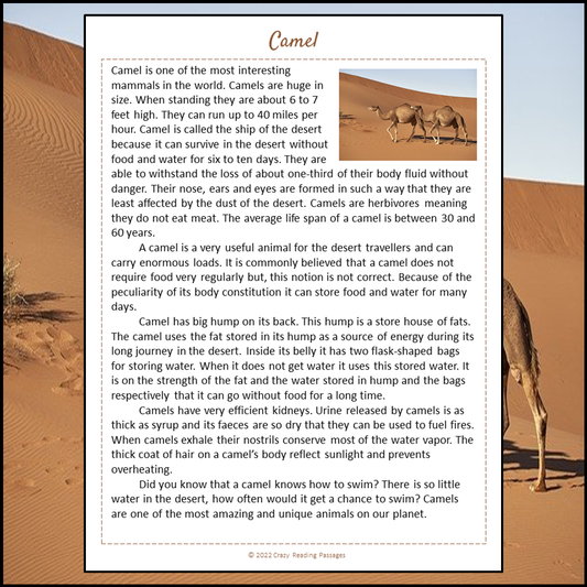Camel Reading Comprehension Passage and Questions | Printable PDF